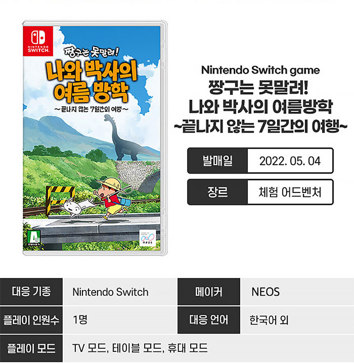짱구의 여름 방학은 2022년 5월 4일에 출시합니다. 출시 플랫폼은 닌텐도 스위치(Nintendo Switch)입니다. 장르는 어드벤처로 전체이용가입니다. 플레이 인원수는 1명이고, TV모드, 테이블 모드, 휴대 모드 모두 가능합니다.