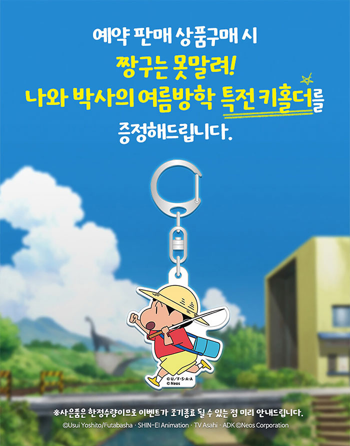 '짱구의 여름방학'은 4월 8일부터 예약판매가 시작되었습니다. 예약 특전으로는 짱구 아크릴 키홀더를 증정합니다. 낚싯대를 들고 뛰어가는 짱구가 매우 귀엽습니다. 짱구를 좋아하시는 분들이라면 예약 구매를 하시는 것도 좋을 것 같습니다.