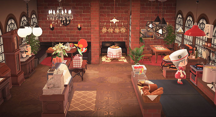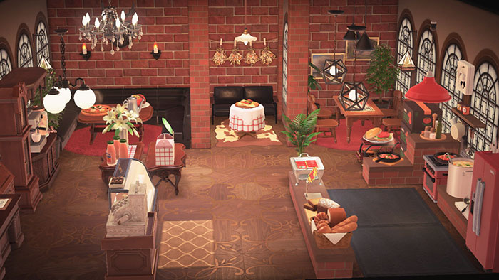 실내 공간에는 칸막이벽을 이용해 테이블마다 공간을 나눠주고 싶었다. 가족, 연인, 친구와 함께 프라이빗한 식사 공간을 만들어줄 예정이다. 벽지는 갈색 벽돌 벽과 예쁜 창문 벽을 사용했고, 바닥은 금색 패턴 바닥을 사용했다. 그리고 칸막이 벽이 어색하지 않도록 벽돌 기둥으로 마무리를 해주었다.