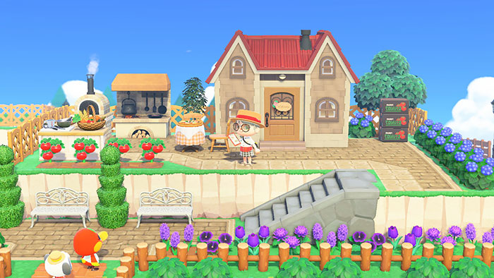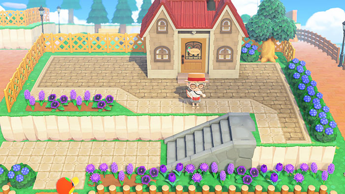 잔디 바닥보다는 타일 바닥이 있는 게 더 좋을 것 같아서 깔아주었다. 주위엔 꽃을 심어 산뜻한 느낌을 더해주었다. 본섬에서 교배를 통해 보라색 꽃을 얻게 되었는데, 이것을 이제 별장 꾸미기에도 사용할 수 있게 되었다.